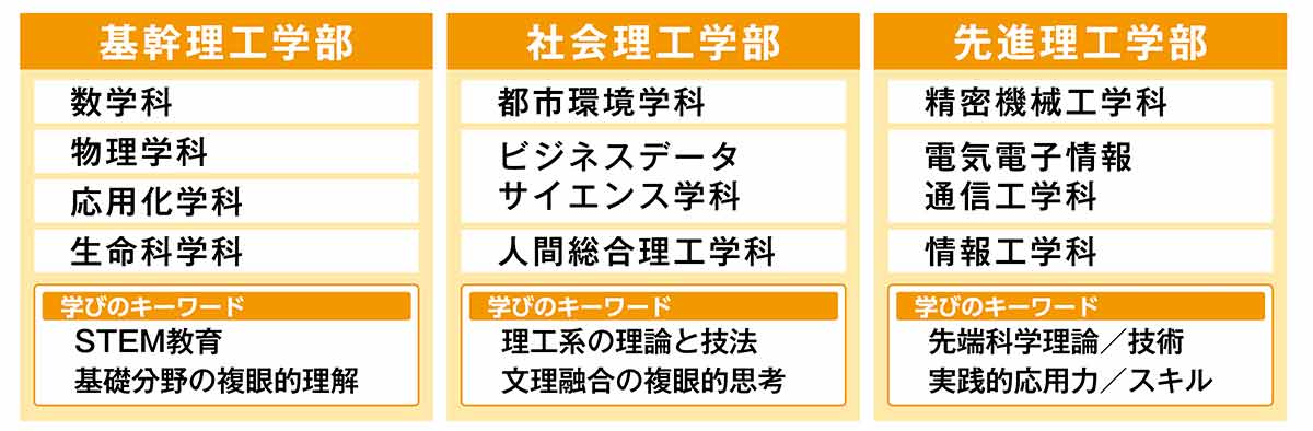 2026年4月、現在の理工学部に設置している10学科を、その特色を踏まえ3学部に再編し、後楽園キャンパス(東京都文京区)に「基幹理工学部」「社会理工学部」「先進理工学部」の3学部を開設します!